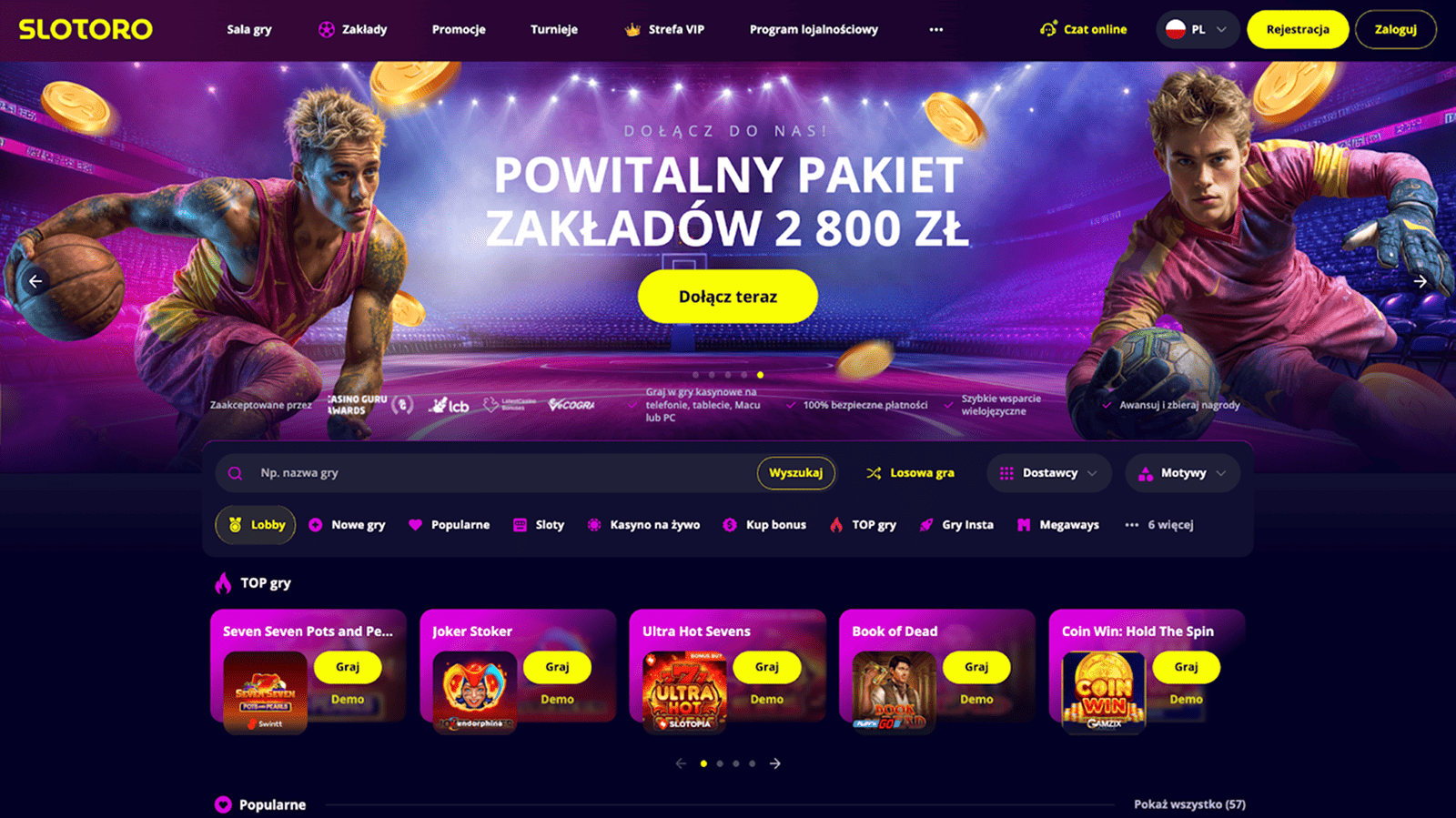 Zwróć uwagę, że oprogramowanie w Slotoro dostarczają znani producenci, co przekłada się na stabilność i szybkie ładowanie gier. Każdy automat do gry działa na certyfikowanym RNG, więc wynik jest losowy i uczciwy. W sekcji Gry-Online znajdziesz klasyczne sloty, Megaways, jackpoty oraz stoły kasynowe dostępne 24/7.